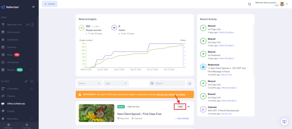 Next, find the offer you would like to start displaying and click Edit.
