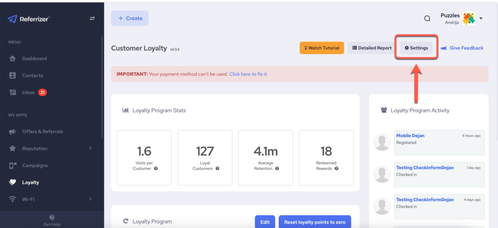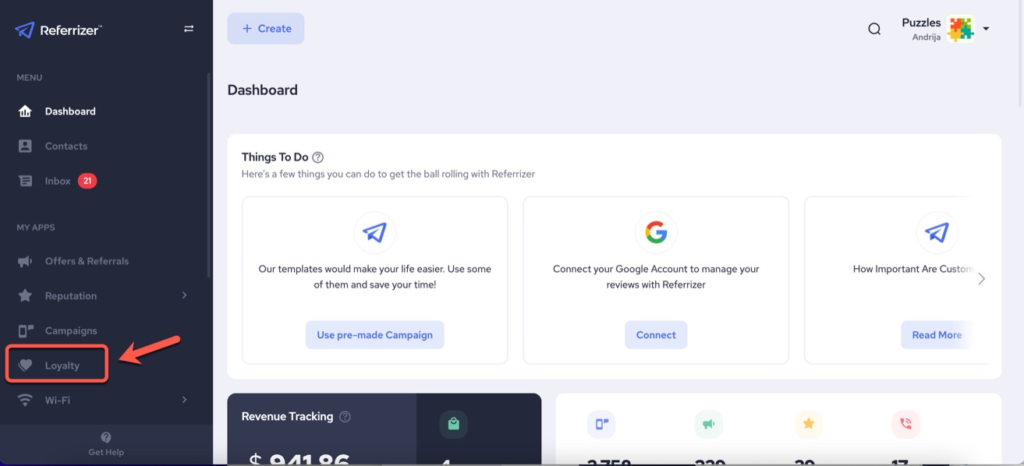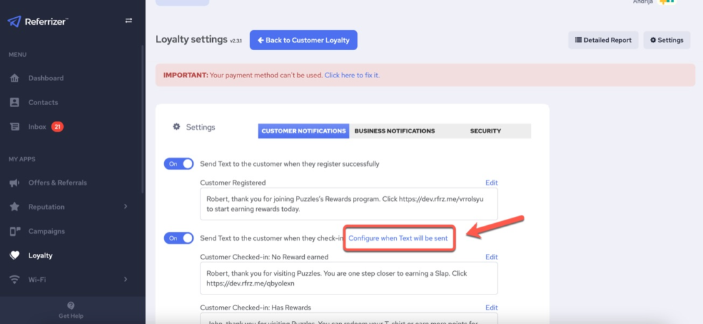 Here’s how to edit the frequency of automated texts from the Loyalty Screen. First, click Loyalty on the left-hand side.