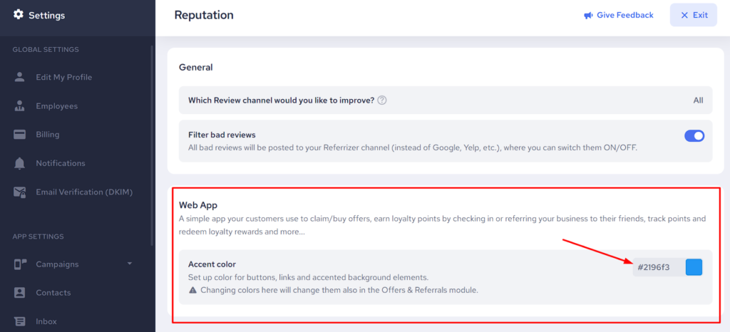 Yes, you can customize the appearance of the loyalty WebApp in the Referrizer platform, but customization options are limited. Currently, the only aspect that can be personalized is the color scheme. To change the color, navigate to the Reputation -> Settings page within the platform. All other elements of the WebApp’s appearance are hard coded and cannot be edited. This ensures consistency and reliability in the user interface, while still allowing some level of brand alignment through color customization.