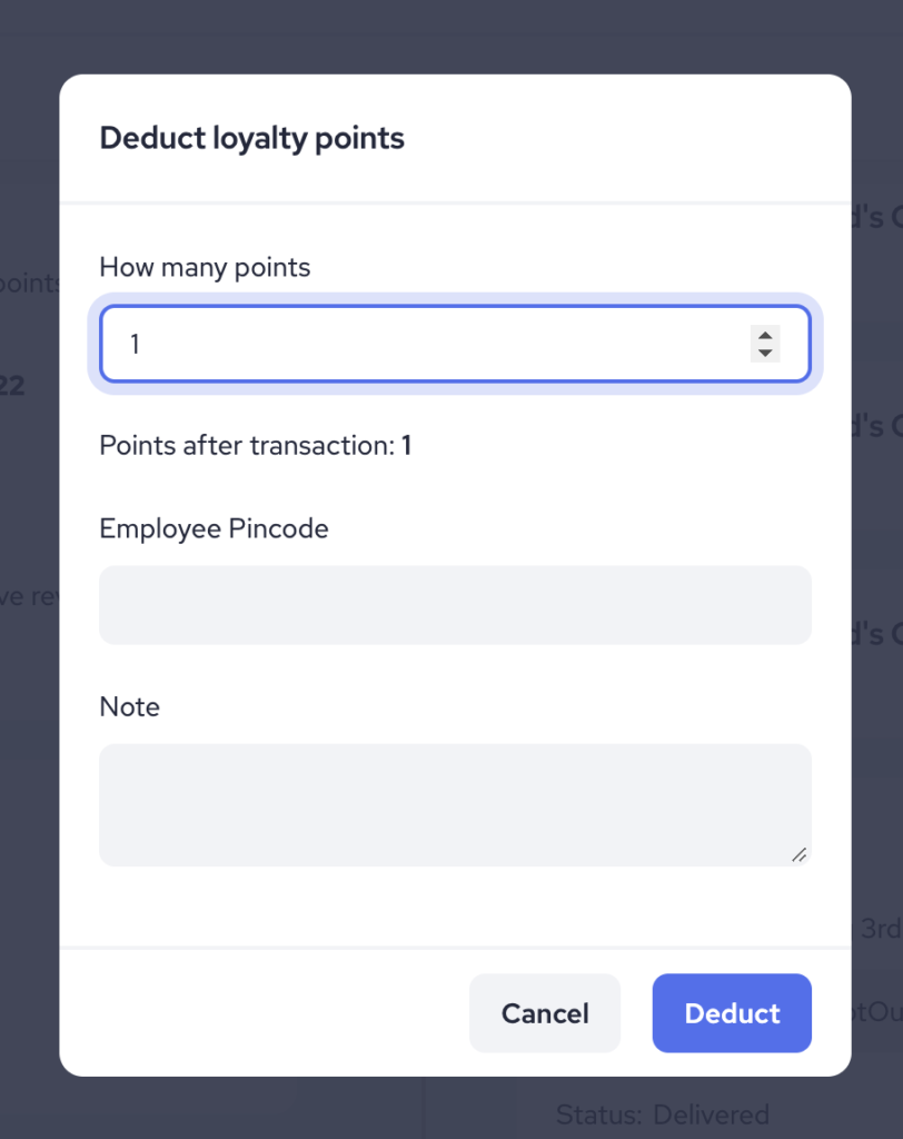 Input the number of points that need to be deducted. You will be required to enter a pin code to verify that you have authorized the deduction of points.