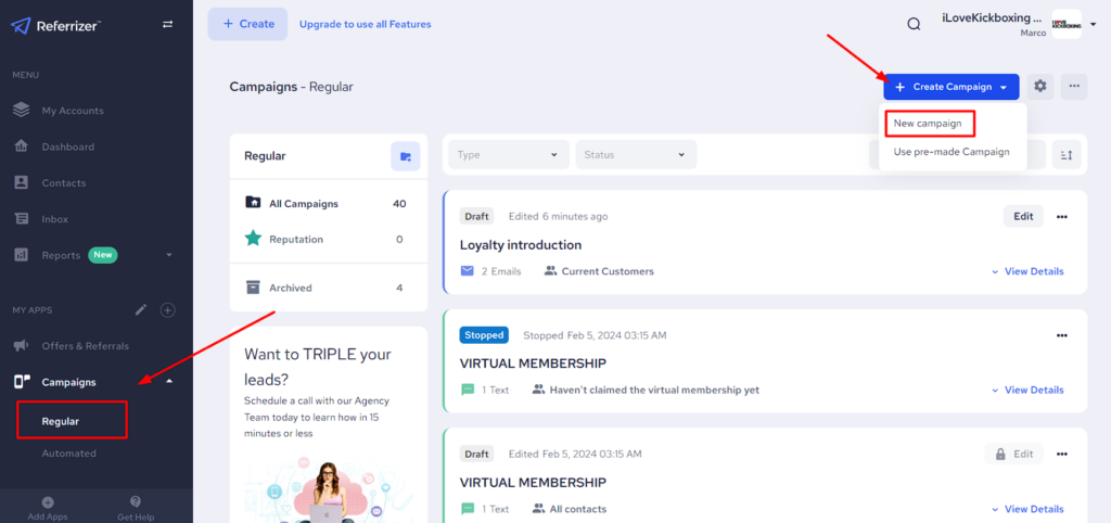 All you need to do is go to your Regular Campaigns and create a New Campaign, like it shows below.