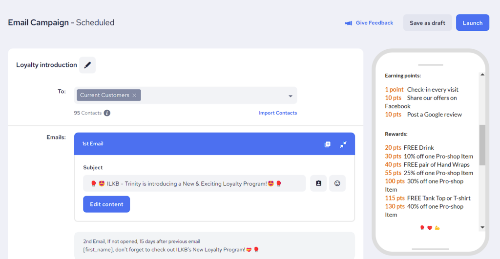 The Email Campaign can be more detailed with all of the Loyalty Rewards listed along with the different ways of earning more loyalty points.