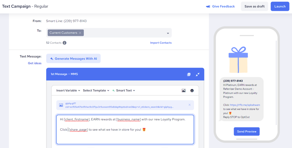 The text campaign on the other hand should be short and straight to the point with the [share_page] variable added, so your customers can enter the Loyalty Program with their phones.