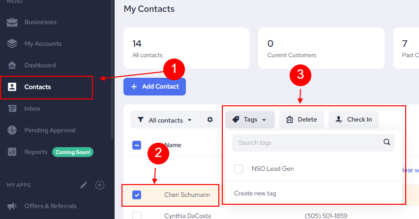 Check the box in front of the Contact that you want to add a Tag to
