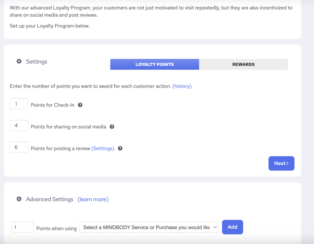 Loyalty points can be earned by checking-in every time a customer visits; sharing your offers on Facebook and posting an online review. If you have integrated your Referrizer account with Mindbody, you can reward customers with additional loyalty points for Mindbody purchases.