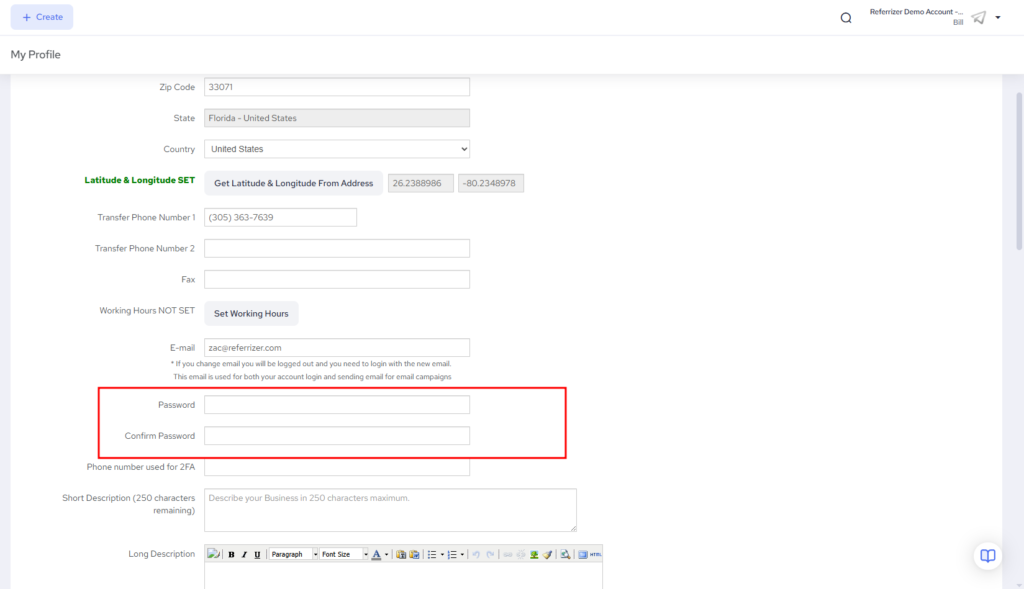 Periodically you may decide to change your login password for your Admin Referrizer Account. You can do this directly from your company profile settings.