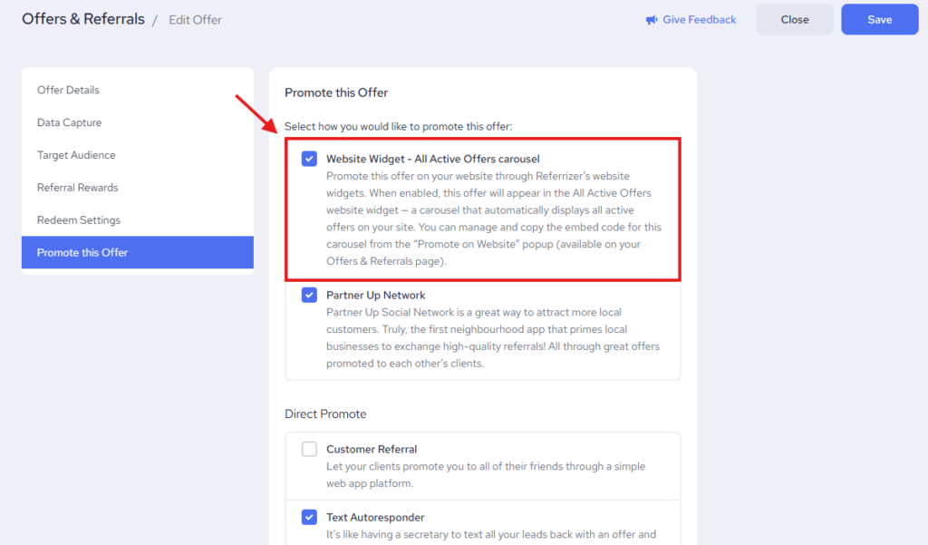 3. On the Promote this Offer tab, check the Website Widget button.