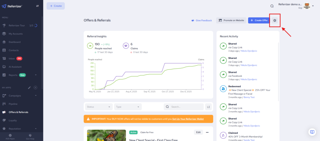 - From the Offers & Referrals, go to Settings in the top right corner.