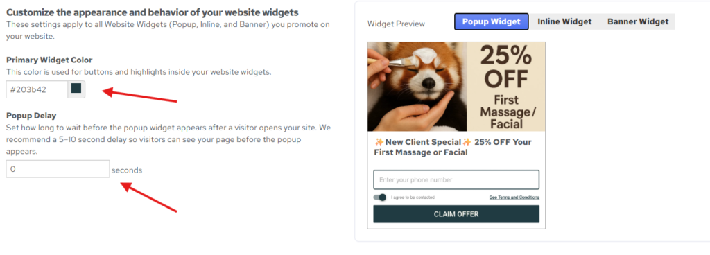 3. Choose a color for the “Claim Offer” button to match your branding. You can preview the widget appearance on the right as you make changes.