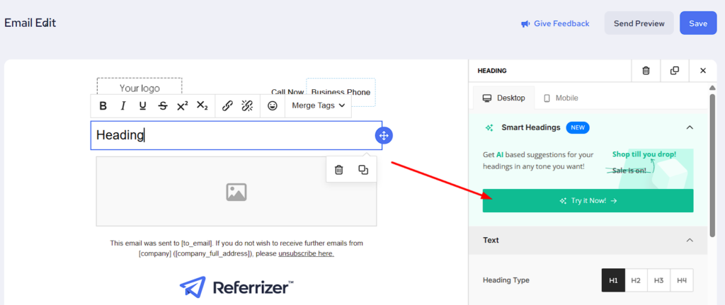 1. SMART HEADINGS – All you need to do is add a suggestive heading and it will automatically generate a list of relatable email headings to choose from.