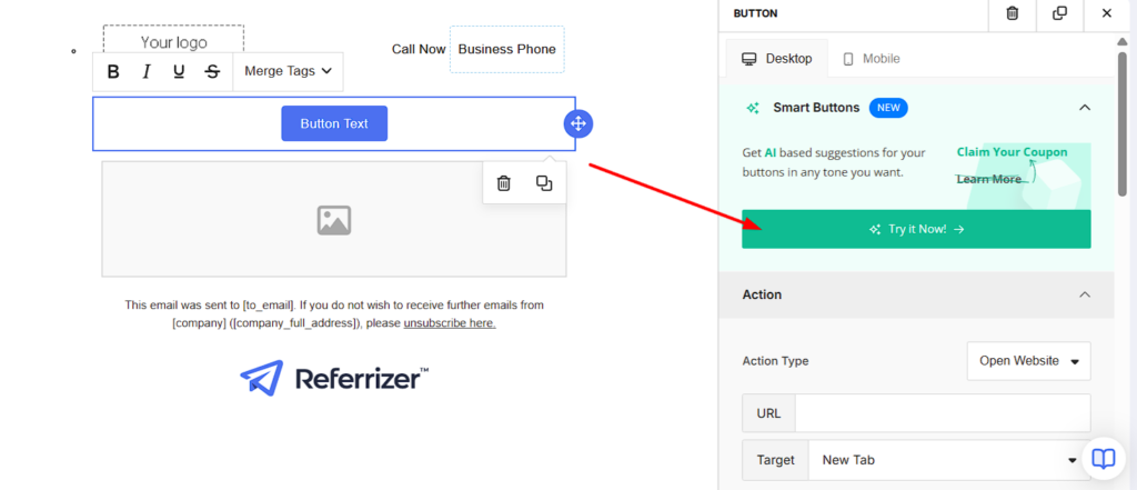 4. SMART BUTTONS – Last but not least, our AI-powered smart button feature is also a total steal. Now you can add the most conversion-worthy Call-To-Action button in emails. Just add a relevant suggestion, and it will automatically generate a list of CTAs to choose from. Look how amazing this is.