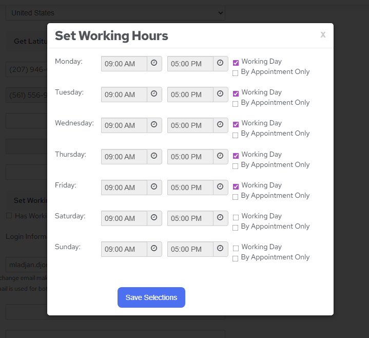 - Once you have made your changes, click the “Save Selections” button at the bottom of the pop-up to save your new working hours.