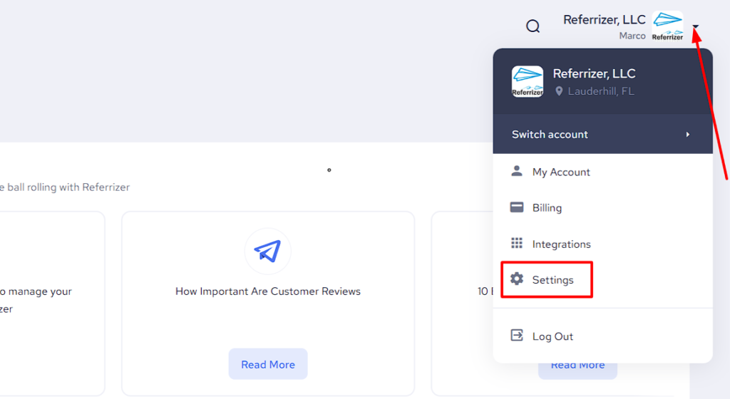 - Navigate to your Referrizer Settings by clicking the logo in the top-right corner as displayed below.