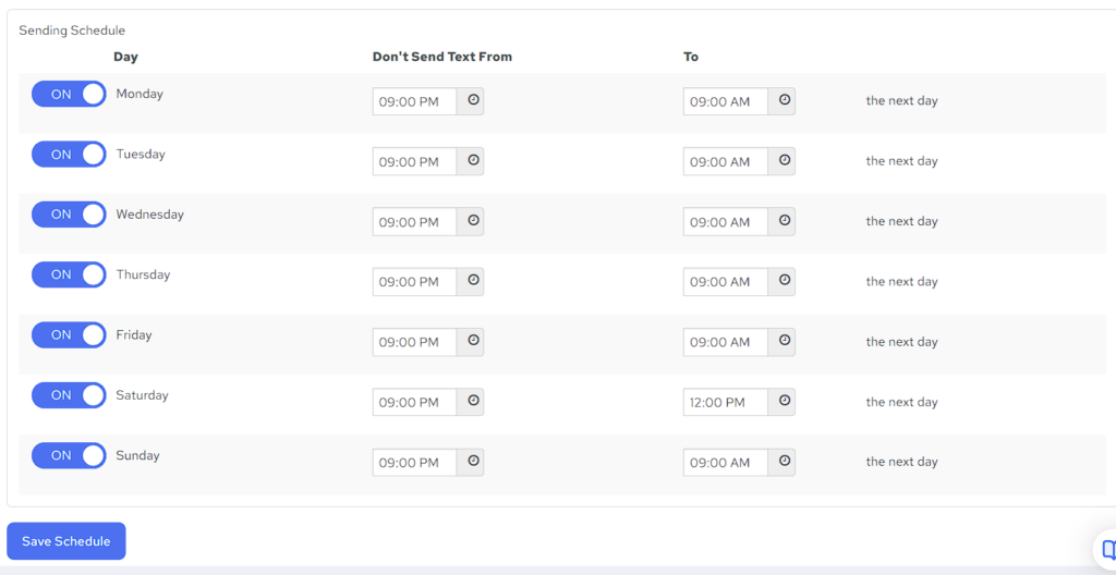 - Turn ON/OFF sending texts on any particular day or simply adjust your desired start and end times for the quiet hours and don’t forget to save your changes once you’re finished.