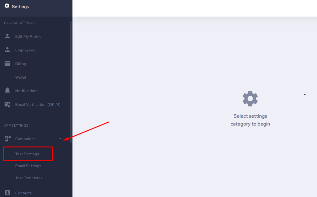 - Now navigate to the Campaigns drop-down menu from the App Settings on the left-hand side and select Text Settings as displayed below.