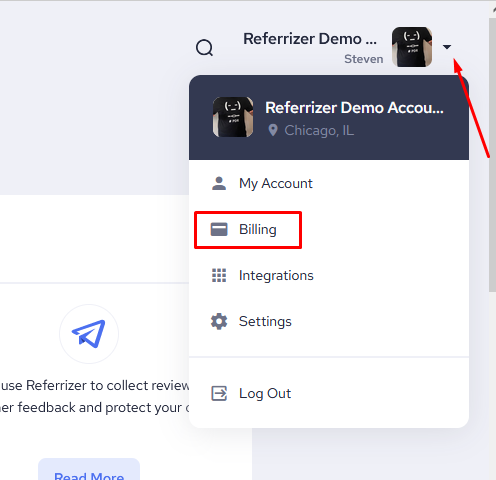 1. Click your Logo in the top right corner and a dropdown list will appear – select Billing.