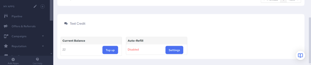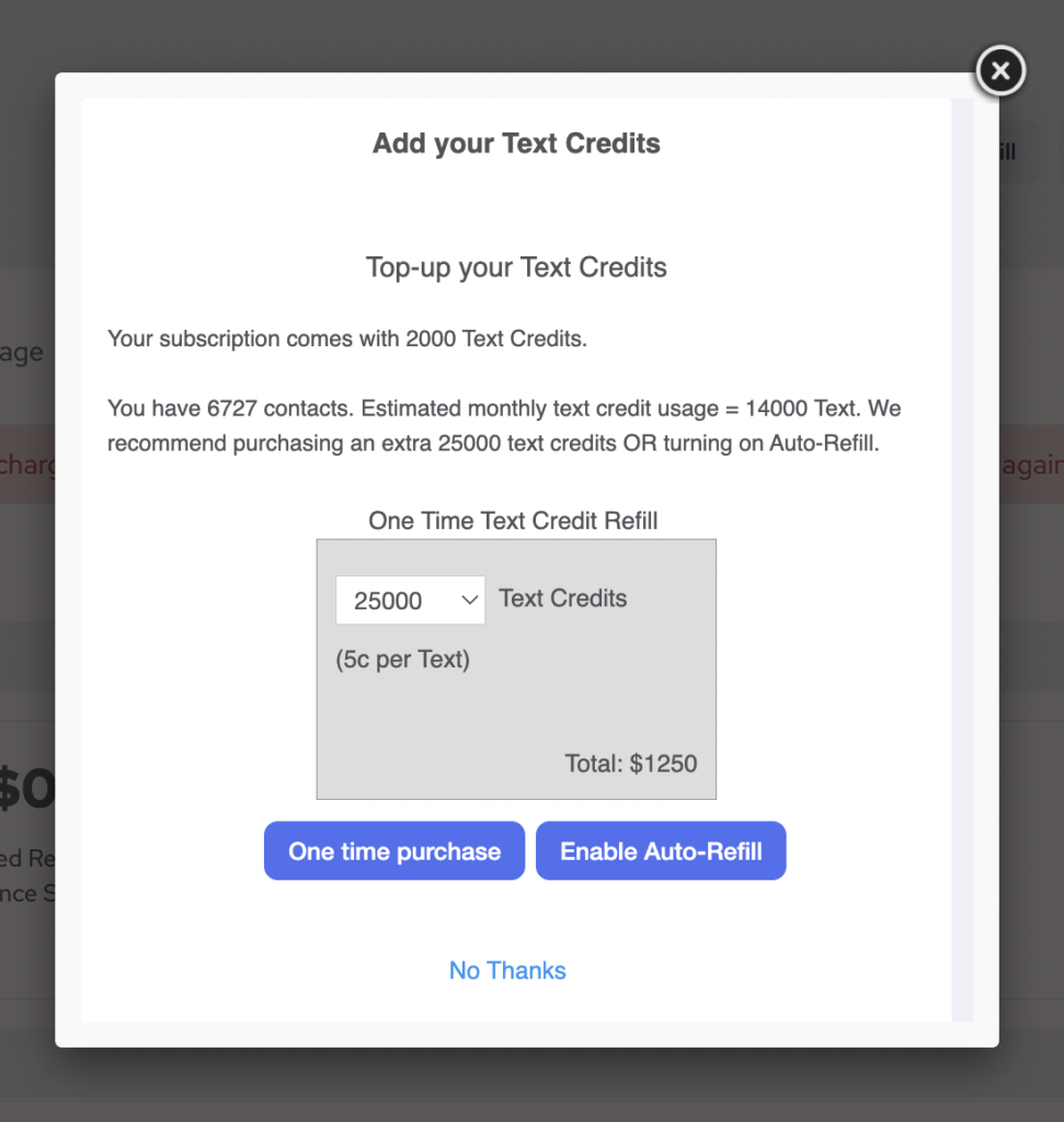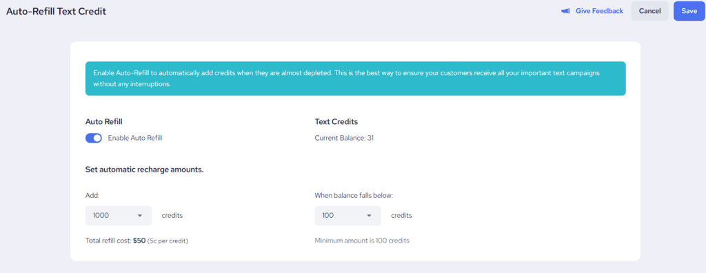 – The Auto Refill option will be applied every time the number of text credits goes below the amount you select as shown below.
