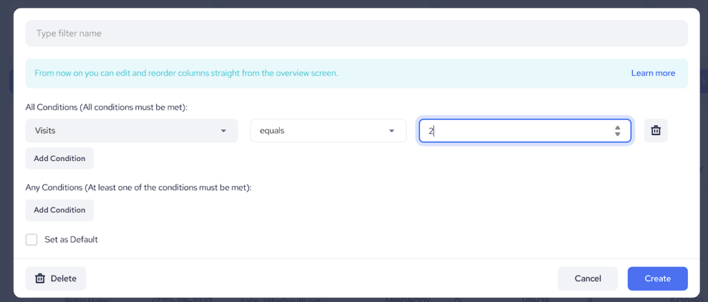 Example: If the condition is set to “Visits – greater than – 2,” the system checks who has more than 2 visits at the time of campaign creation. These contacts will not receive the campaign.