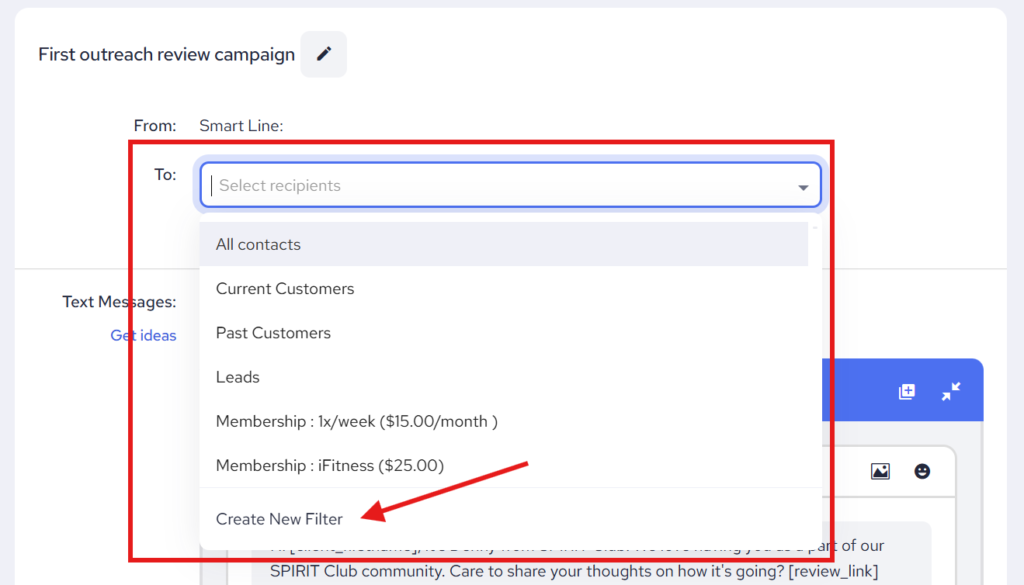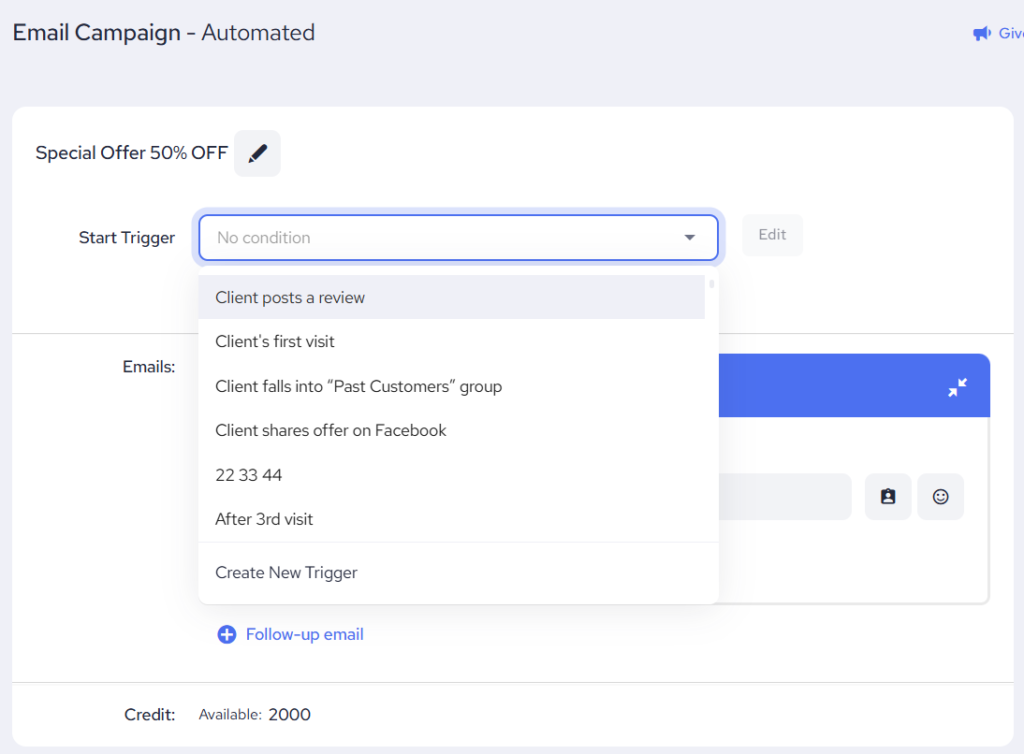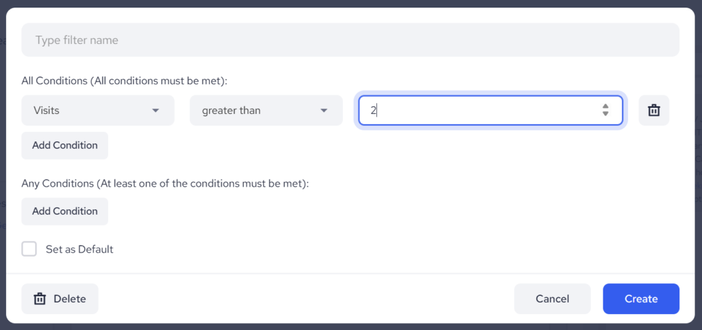 Setting up the Trigger: When creating a regular campaign (email or SMS), you can set filters based on trigger’s conditions, such as “Visits – equals – 2.”
