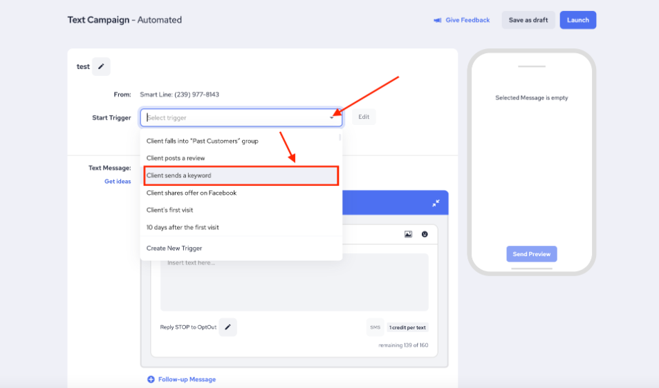 Simply set up the new keyword trigger, designate your preferred keyword, and watch as your clients receive customized text messages each time they text that keyword to your Smart Line.