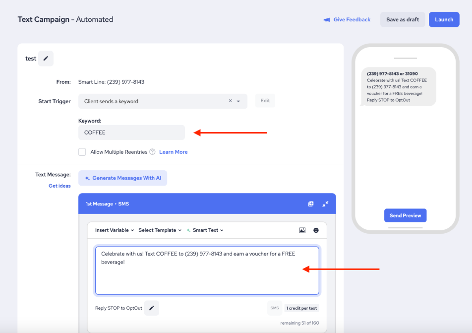 1. The text message will trigger every time a customer sends the keyword to the Smartline, not just the first time. Every time it triggers, you will be using your available text credit (we recommend turning on our Auto-Refill feature!). But with our Multiple Reentries Feature, you can control when and how often this can happen.