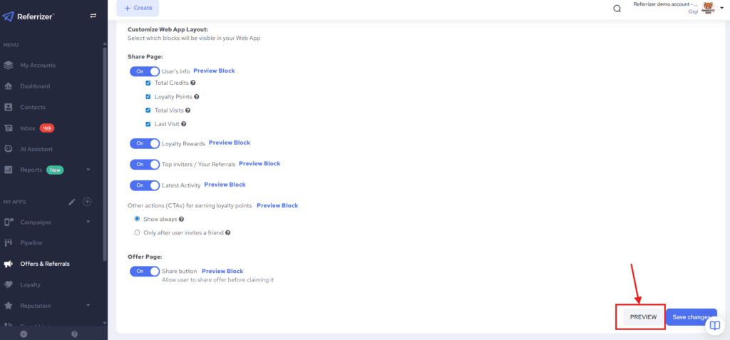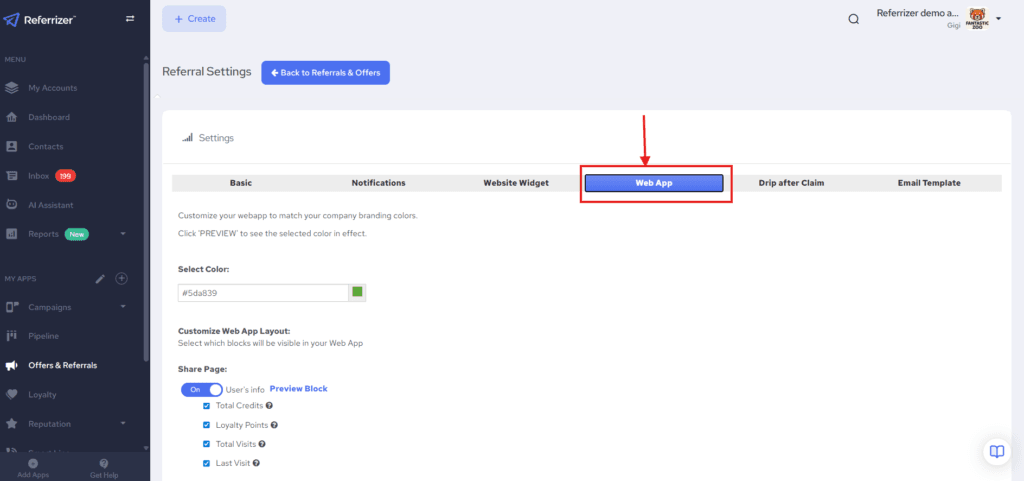 - Go to the Offers & Referrals page, click on Settings, and select the Web App tab.