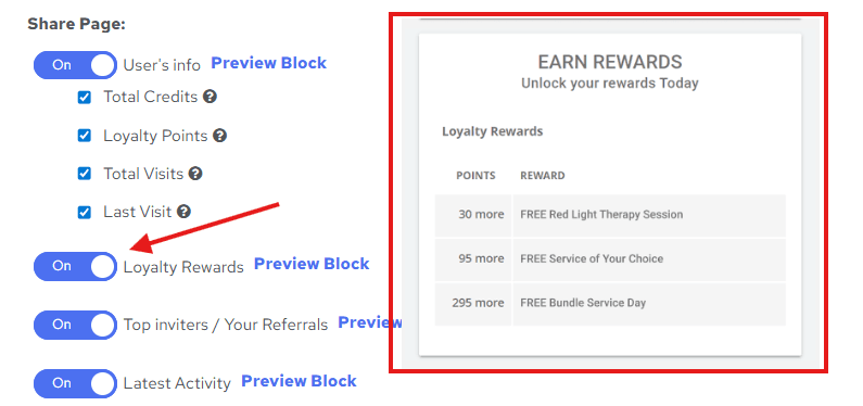- Enable the switch to show the Loyalty Rewards block, so users can view their rewards.