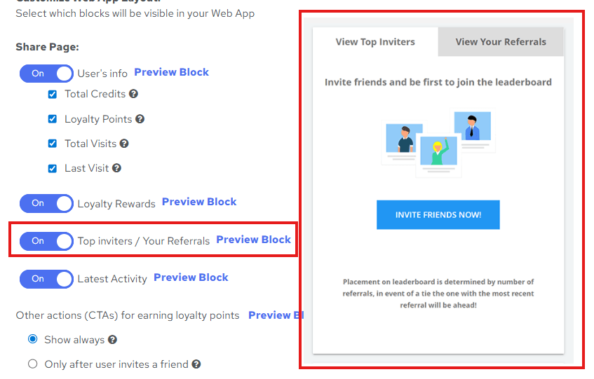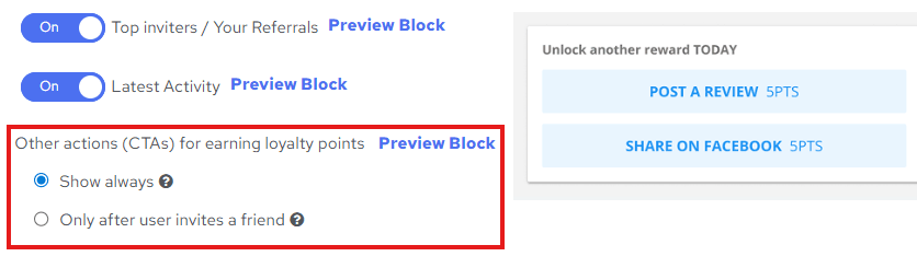 - You can choose to show extra ways to earn loyalty points, either always or after friends have been invited.
