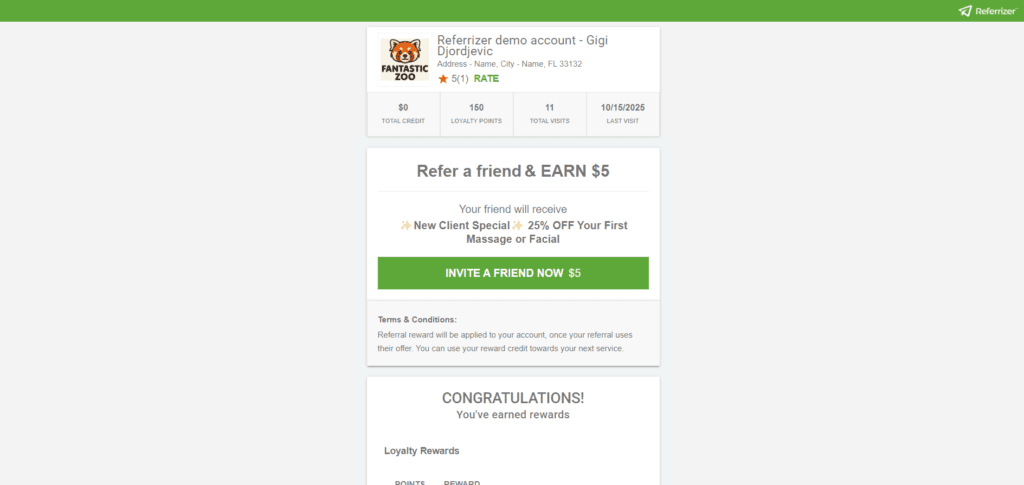 The Referrizer Web App (also known as the Share Page) allows customers to track their loyalty points, rewards, and credits, while easily sharing offers with friends via email, text, or social media platforms like Facebook. This personalized page helps customers stay engaged and rewards their loyalty.