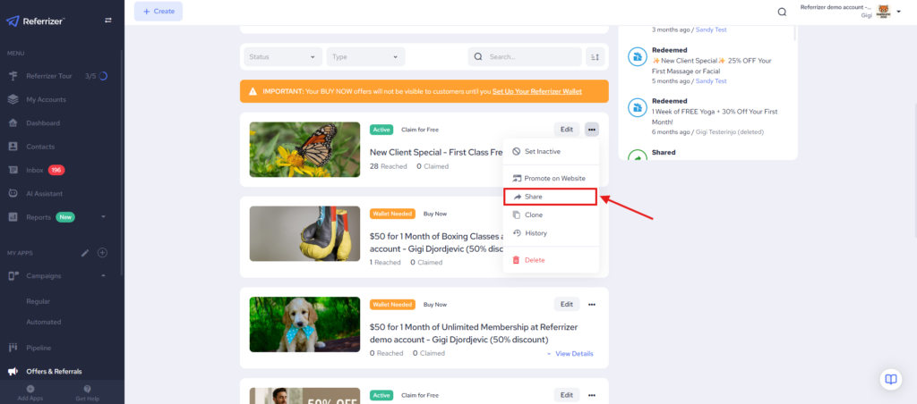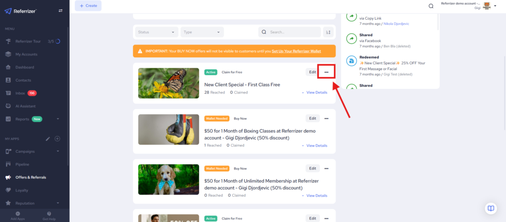 Next, find the offer you would like to share and click the 3 dots on the right.