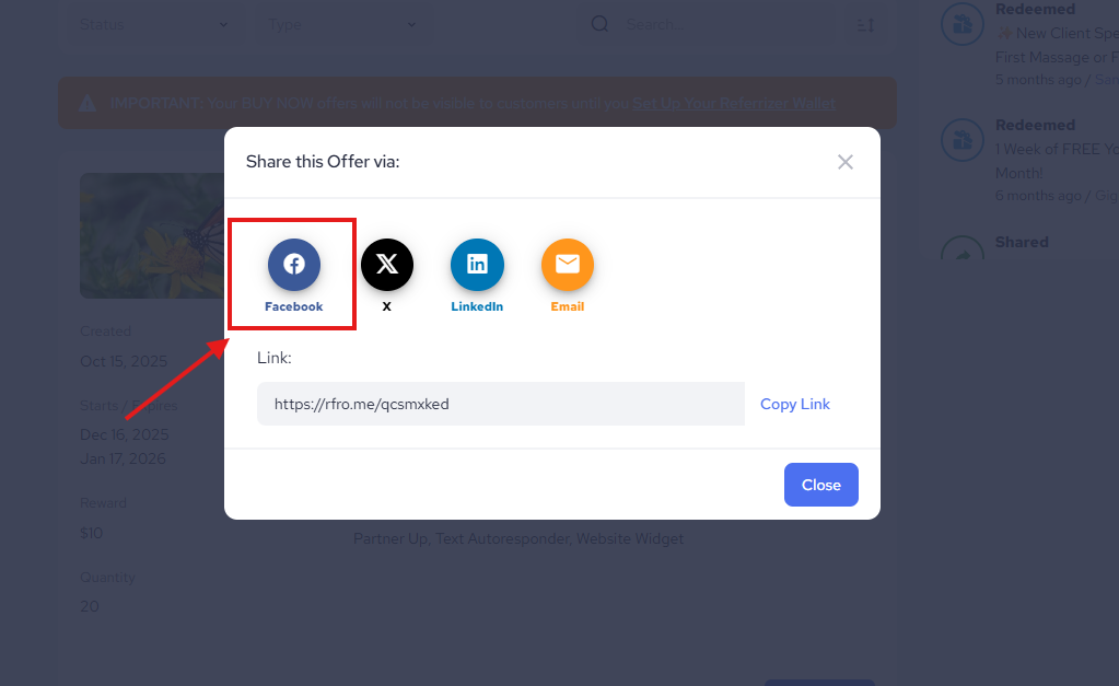To share your Claim For Free / Buy Now Offer on Facebook, first click on Offers & Referrals in the left side of your account.