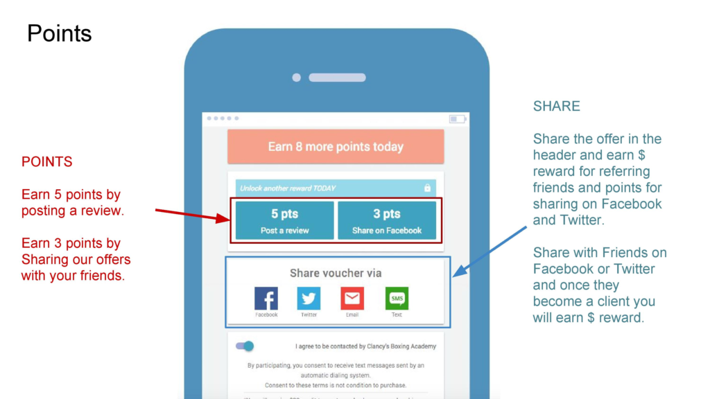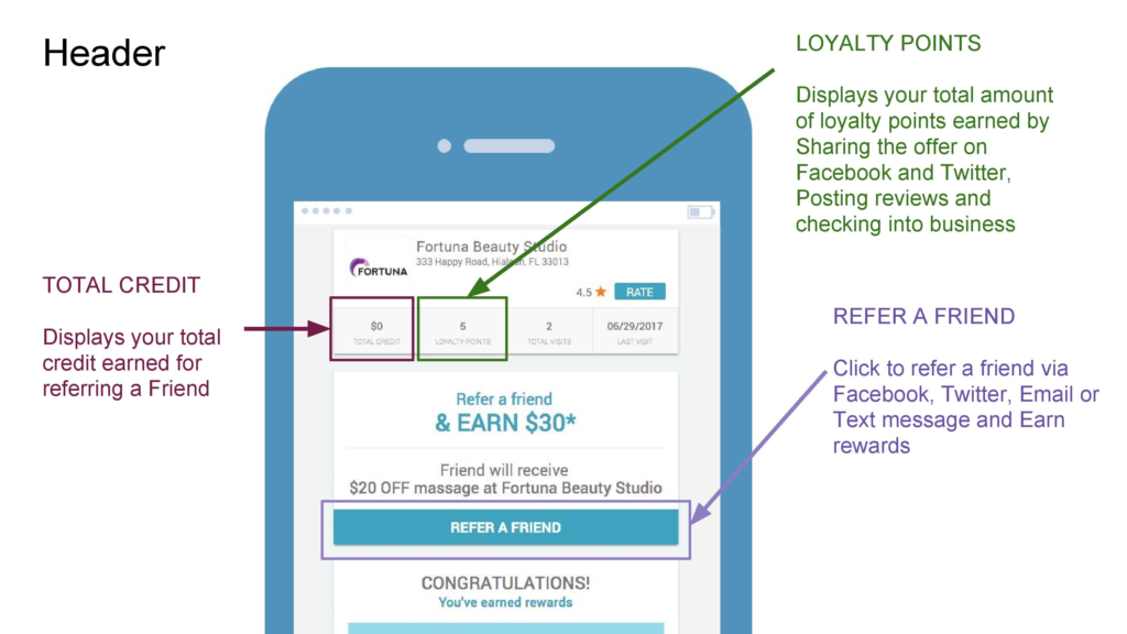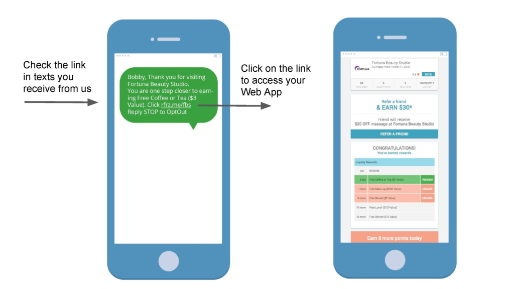 After a check-in (visit) an SMS text with a WebApp link is being sent to your customers to check their loyalty points, referral credit, and ways to earn more by sharing promotions, giving reviews and referring friends.