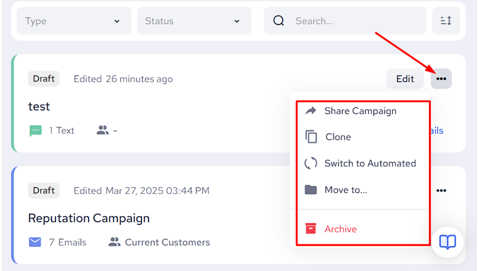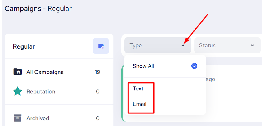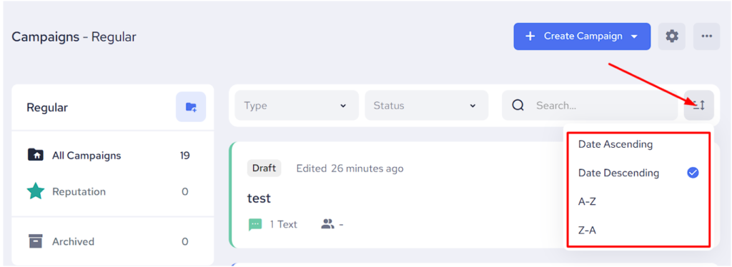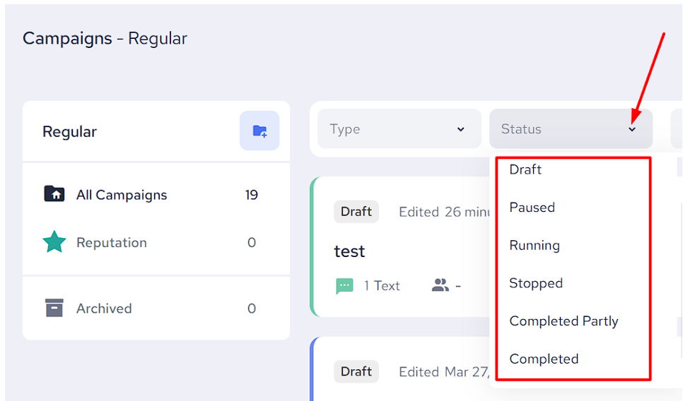 - Filter your campaigns by Status (draft, paused, running, etc.)